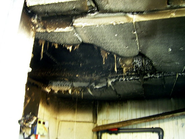 On voit ici plus clairement que le polystyrène ignifugé a empêché la propagation du feu et a provoqué son extinction. |