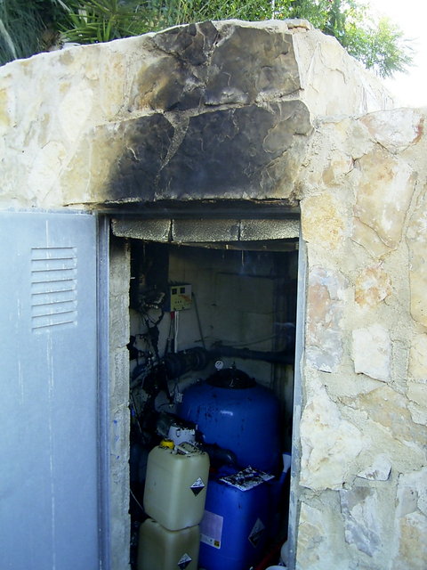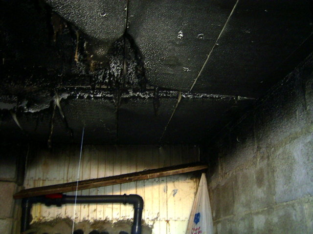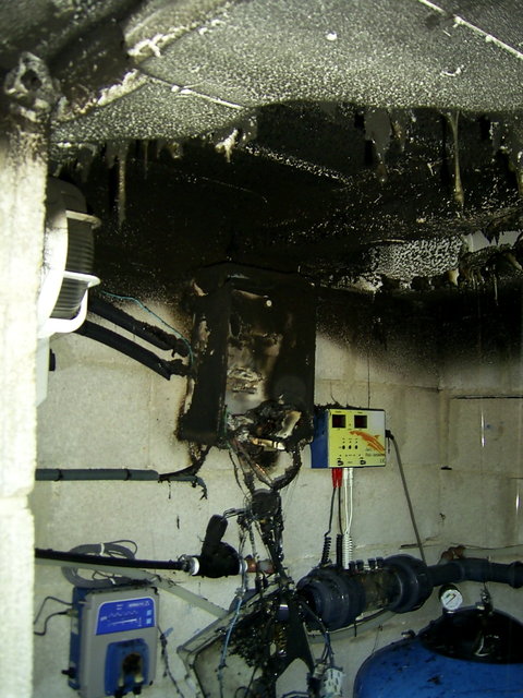 Ici, à l'arrière-plan, on peut également voir le mur de la piscine, fait de blocs de polystyrène, et le plafond « n'a pas pris feu » |